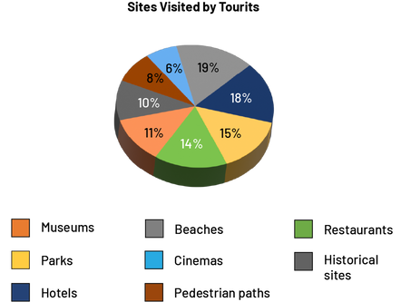 image The pie chart is called Sites Visited by Tourists. It is divided into eight parts. The share of museums is eleven percent, in orange. The share of parks is 14 percent, in yellow. The share of hotels is 18 percent, in navy blue. The share of beaches is 19 percent, in gray. The share of movie theaters is six percent, in light blue. The share of hiking trails is eight percent, in brown. The share of restaurants is 14 percent, in green. And the share of historic buildings is ten percent, in dark gray.