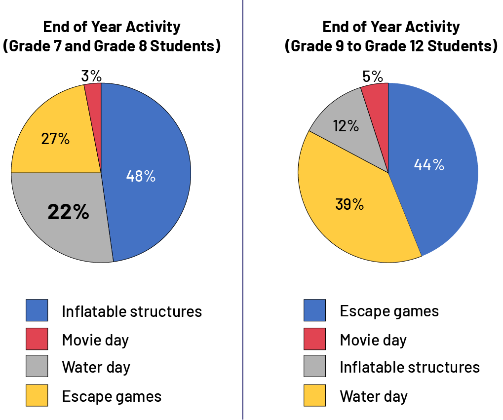 image Two pie charts are presented. The first pie chart is titled End of Year Activity, Grade 7 and grade 8 students. It is divided into four parts. The share for inflatable structures is 48 percent, in blue. The number is written in white while all others are in black. The movie day share is three percent, in red. The water day share is 22 percent, in gray. The number is shown in bold type. And the escape games share is 27 percent, in yellow. The second chart is End of Year Activity, Grade 9 and Grade 12 students. It is divided into four parts. The escape games portion is 44 percent, in blue. The number is written in white while all others are in black. The movie day portion is five percent, in red. The inflatable structures share is twelve percent, in gray. And the water day share is 39 percent, in yellow.