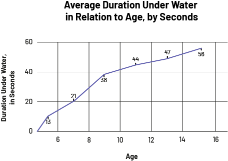 image The broken line graph is titled "Average Duration Under Water in Relation to Age, by Seconds". The horizontal axis is called "Age" and scales from zero to 16. The vertical axis is called "Duration Under Water, in Seconds" and scales from zero to 60. The line starts from zero and goes up diagonally. The dots on the vertical axis are located as follows: 13, 21, 38, 44, 47, 56. On the horizontal axis, the line stops at 15.