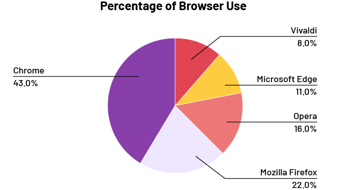 image The pie chart illustrates the percentage of browser use. It is divided into five parts. Chrome represents 43 percent. Vivaldi represents 12 percent. Microsoft Edge represents 11 percent. Opera accounts for 16 percent. And Mozilla Firefox represents 22 percent.