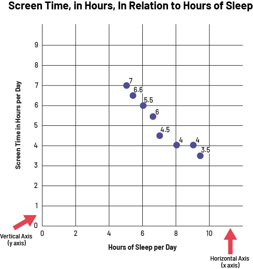 image The broken line graph is titled "Screen Time, in Hours, In Relation to Hours of Sleep". The horizontal axis, scaled from zero to ten, is named "Hours of Sleep per Day", while the vertical axis, scaled from zero to 9, is named "Screen Time in Hours per Day". A red arrow points to the vertical axis, indicating that it is also called the "why" axis. A red arrow points to the horizontal axis, indicating that it is also called the "x" axis. The dots are located at the following points. Between four and six on the horizontal axis, one dot is at 7 and the other at six point six on the vertical axis. At six on the horizontal axis, the dot is at five point five on the vertical axis. Between six and eight on the horizontal axis, one dot is at six and the other at four point five. At eight on the horizontal axis, the dot is at four on the vertical axis. At nine on the horizontal axis, the dot is at four on the vertical axis. And between eight and ten on the horizontal axis, the dot is at three point five on the vertical axis.
