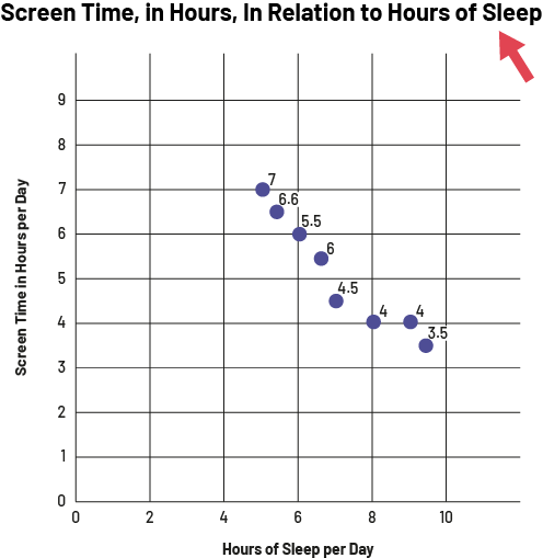 image The broken line graph is titled "Screen Time, in Hours, In Relation to Hours of Sleep". A red arrow points the title. The horizontal axis, scaled from zero to ten, is named "Hours of Sleep per Day", while the vertical axis, scaled from zero to 9, is named "Screen Time in Hours per Day".The dots are located at the following points. Between four and six on the horizontal axis, one dot is at 7 and the other at six point six on the vertical axis. At six on the horizontal axis, the dot is at five point five on the vertical axis. Between six and eight on the horizontal axis, one dot is at six and the other at four point five. At eight on the horizontal axis, the dot is at four on the vertical axis. At nine on the horizontal axis, the dot is at four on the vertical axis. And between eight and ten on the horizontal axis, the dot is at three point five on the vertical axis.