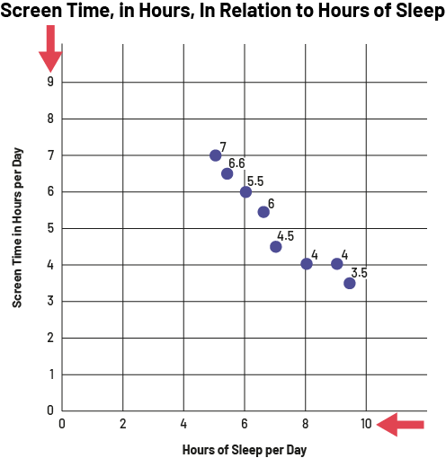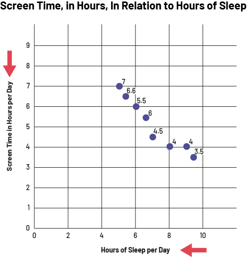 image The broken line graph is titled "Screen Time, in Hours, In Relation to Hours of Sleep". A red arrow points the horizontal axis, scaled from zero to ten, which is named "Hours of Sleep per Day". A red arrow points the vertical axis, scaled from zero to 9, which is named "Screen Time in Hours per Day".The dots are located at the following points. Between four and six on the horizontal axis, one dot is at 7 and the other at six point six on the vertical axis. At six on the horizontal axis, the dot is at five point five on the vertical axis. Between six and eight on the horizontal axis, one dot is at six and the other at four point five. At eight on the horizontal axis, the dot is at four on the vertical axis. At nine on the horizontal axis, the dot is at four on the vertical axis. And between eight and ten on the horizontal axis, the dot is at three point five on the vertical axis.