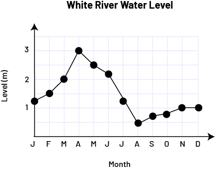 image The broken line diagram with connected dots is titled "White River Water Level". The horizontal axis is named "Month" while the vertical axis, graduated from zero to three, is named "Level in meters". At the letter J, the point is slightly above one. At the letter F, the point is at one and a half. At the letter M, the point is at two. With the letter A, the dot is at three. With the letter M, the dot is two and a half. At the letter J, the point is above two. At the next letter J, the dot is between one and one and a half. At the letter A, the point is at one and a half. At the letter S, the dot is below one. At the letter O, the dot is slightly closer to number one. At the letter N and the letter D, the dot is at one.