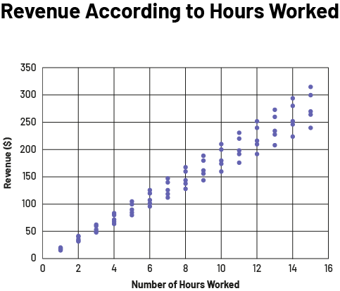 image The scatted diagram is called "Revenue According to Hours Worked". The horizontal axis is graduated from zero to 16 and is called "Number of hours worked", while the vertical axis is graduated from zero to 350 and is called "Revenue in dollars". Between zero and one, the dots are clustered. As we move forward in the chart, they all line up on the diagonal, and tend to spread apart from each other.