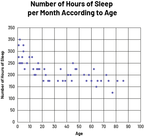 image The scatter diagram is titled "Number of hours of sleep per month according to age". The horizontal axis is scaled from zero to 100 and corresponds to age, while the vertical axis is scaled from zero to 350 and is called "Number of hours of sleep". Between zero and ten years, the dots are between 225 and 350, and then tend to go down with age. The trend goes up a bit between the ages of 35 and 50, and then around 60. The lowest dot is around 125, around age 75.