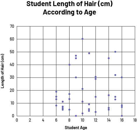 image The scatter diagram is titled "Student Length of Hair in centimeters According to Age". The horizontal axis is called "Student Age" and is scaled from zero to 18, while the vertical axis is called "Length of hair in centimeters" and is scaled from zero to 70. The scatterplot is quite large.