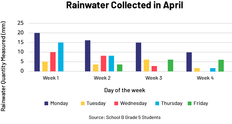The title of the vertical multiple bar diagram is: Rainwater collected in April. The title of the x-axis is: Day of the week. The axis is graduated in four weeks, i.e. week 1, week 2, week 3 and week 4. The title of the y-axis is: Rainwater quantity measured (in millimeters). The axis is graduated by 5, from 0 to 25. There is a legend: blue is Monday, yellow is Tuesday, red is Wednesday, light blue is Thursday and green is Friday. Below the legend it says "Source: School B Grade 5 Students".