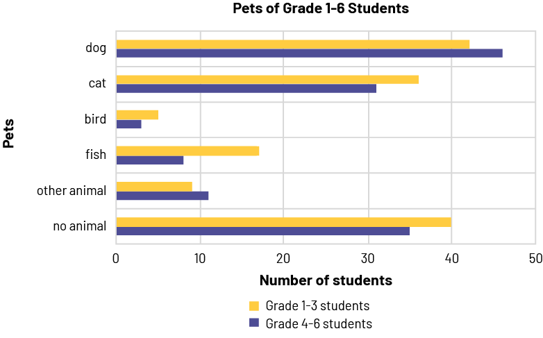image A double horizontal bar graph is titled "Pets of Grade 1 to 6 Students." The yellow bars correspond to students in grades one through three, while the purple bars correspond to students in grades four through six. The horizontal axis is named "Number of Students" and is graduated from zero to 50. The vertical axis is named "Pets". For the dog, the horizontal yellow bar stops between 40 and 45 while the purple bar goes slightly over 45. For the cat, the yellow bar is slightly over 35 while the purple bar is slightly over 30. For the bird, the yellow bar reaches five while the purple bar stops before five. For fish, the yellow bar stops between 15 and 20 while the purple bar stops between five and ten. For "other animal", the yellow bar stops a little before ten and the purple bar goes slightly over ten. And for "no animal", the yellow bar reaches 40 while the purple bar reaches 35.