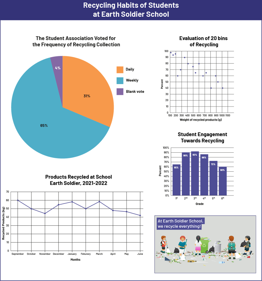 image The infographic is titled "Recycling Habits of Students at Earth Soldier School". First, there is a pie chart titled “The Student Association voted for the frequency of recycling collection". 31 percent voted for daily, 65 percent voted for weekly and 4 percent voted blank. Next, there is a scatter diagram titled "Evaluation of 20 Bins of Recycling". The horizontal axis is named "Weight of recycled products in grams" and is scaled from 100 to 1100, while the vertical axis is named "Percentage" and is scaled from zero to 100. At the beginning of the horizontal axis, the dots are at the top of the vertical axis, and the trend goes in a downward diagonal line.Below the scatter diagram is a bar graph titled "Student Engagement towards Recycling". The horizontal axis is named "Grade" and runs from first to sixth grade. The vertical axis is named "Percentage" and runs from zero to 100. In grade one, the bar rises to 65 percent. In the second year, the bar rises to 90 percent. In the third year, the bar rises to 92 percent. In the fourth year, the bar rises to 86 percent. In the fifth year, the bar rises to 72 percent. And in the sixth year, the bar rises to 60 percent.Below the pie chart is a broken line chart titled "Products recycled at schoolEarth Soldier, 2021 and 2022". The horizontal axis corresponds to the months of September through June , while the vertical axis, graduated from zero to 70, is called "Products Recycled in Kilograms". In September, the dot is at 60 on the vertical axis. In October, the dot is at 50. In November, the dot is at 45. In December, the dot is at 55. In January, the dot is slightly below 60. In February, the dot is at 50. In March, the dot is slightly below 60. In April, the dot is slightly below 50. In May, the dot is between 45 and 50. And in June, the dot is slightly above 40.Underneath the bar graph is an illustration of children picking up trash from a littered floor. It is written, " At Earth Soldier School, we recycle everything!"