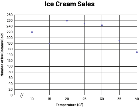 image The scatter diagram is called "Ice Cream Sales". Scaled from ten to 40, the horizontal axis is called "Temperature in degrees Celsius", while the vertical axis is scaled from zero to 280 and is called "Number of ice creams sold". At 10 degrees Celsius, 220 ice creams are sold. At 15 degrees Celsius, 180 ice creams are sold. At 20 degrees Celsius, 260 ice creams are sold. At 25 degrees Celsius, 270 ice creams are sold. At 30 degrees Celsius, 245 ice creams are sold. At 35 degrees Celsius, 190 ice creams are sold. And at 40 degrees Celsius, 150 ice creams are sold.