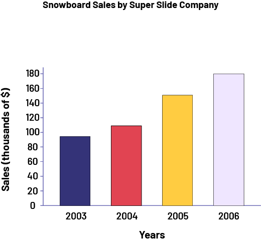 image The bar graph is titled "Snowboard Sales by Super Slide Company". The horizontal axis corresponds to years, while the vertical axis corresponds to sales in thousands of dollars and is graduated from 60 to 180. In 2003, the bar goes up to 90. In 2004, the bar goes up to 110. In 2005, the bar goes up to 150. And in 2006, the bar goes up to 180.