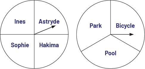 image Two wheels with a needle are placed side by side. The first wheel is divided into four equal parts, each containing a name: Inès, Astryde, Sophie, Hakima. The arrow points to the Astryde part. The second wheel is divided into three equal parts and contains respectively the following words: park, bicycle, pool. The arrow points to the bicycle part.