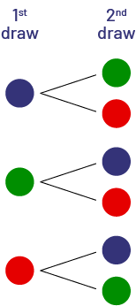 image The tree diagram has two columns: first choice and second choice. Under first choice, three coloured chips are placed one below the other: one blue, one green and one red. Two branches leading to the second choice unfold from each. For the blue chip, the second choice is green or red. For the green chip, the second choice is blue or red. And for the red chip, the second choice is blue or green.