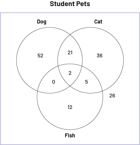 image The Venn diagram is entitled "Student Pets". The first set is called "Dog", the second set is called "Cat" and the third set is called "Fish". At the junction of the three sets is the number two. In the set exclusive to the dog, there is the number 52. In the shared dog and cat set, there is the number 21. In the shared dog and fish set, there is the number zero. In the cat-only set, there is the number 36. In the shared set cat and fish, there is the number five. In the fish-exclusive set, there is the number 12. Outside the diagram, there is the number 26.
