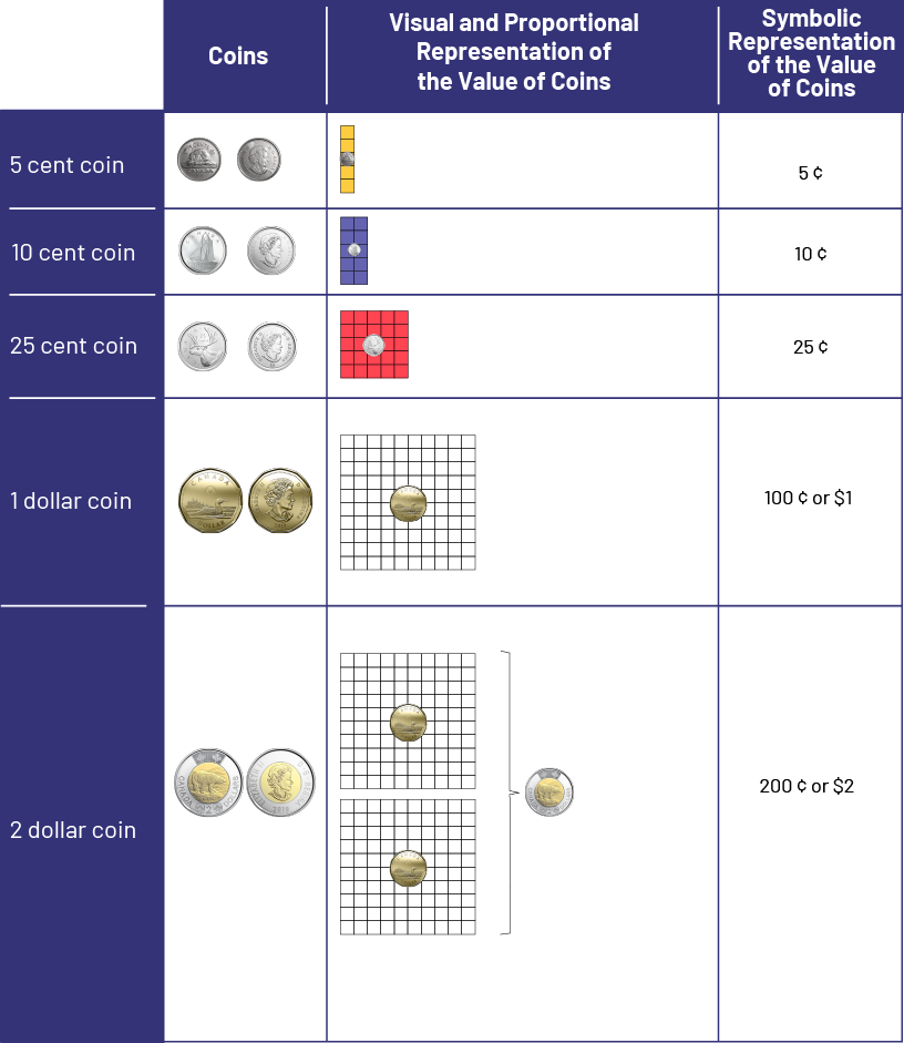 Coin: 5 cents front and back. Visual and proportional representation of the value of coins: a block of 5 yellow squares. Symbolic representation of the value of coins: 5 cents. Coin: ten cents front and back Visual and proportional representation of the value of coins: a block of ten blue squares. Symbolic representation of the value of coins: ten cents. Coin of: 25 cents, front and back. Visual and proportional representation of the value of the coins: a block of 25 red squares. Symbolic representation of coin value: 25 cents Coin: one dollar, front and back. Visual and proportional representation of the value of the coins: a block of 100 white squares. Symbolic representation of the value of coins: 100 cents or a dollar. Coin: 2-dollar coin, front and back. Visual and proportional representation of the value of the coins: 2 blocks of 100 white squares. Symbolic representation of coin value: 200 cents or 2 dollars.