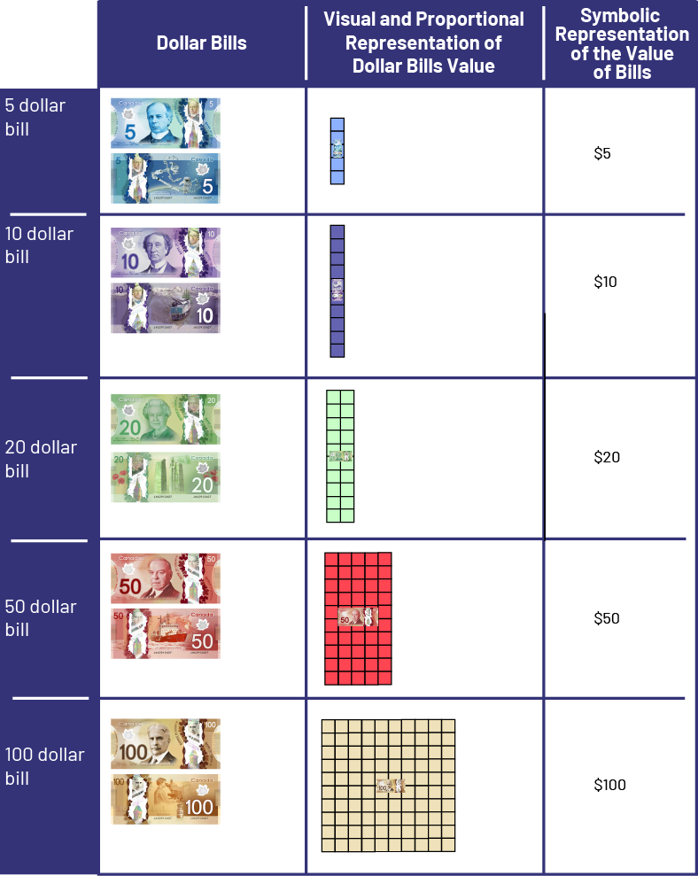 Money bill: 5 dollars, front and back. Visual and proportional representation of the value of bills: a block of 5 blue squares. Symbolic representation of the value of the bills: 5 dollars. Money bill: ten dollars, front and back. Visual and proportional representation of the value of bills: a block of ten purple squares. Symbolic representation of the value of bills: ten dollars. Money bill: 20 dollars, front and back. Visual and proportional representation of the value of bills: a block of 20 green squares. Symbolic representation of the value of the bills: 20. dollars Money bill: 20 dollars, front, back. Visual and proportional representation of the value of bills: a block of 50 red squares. Symbolic representation of the value of the bills: 50 dollars. Money bill: 100 dollars, front and back. Visual and proportional representation of the value of bills: a block of 100 brown squares. Symbolic representation of the value of the bills: 100 dollars.