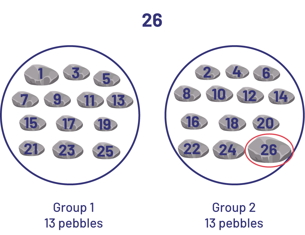 I started by counting 26 pebbles. I placed one pebble in group 1 and another in group 2. I continued to divide the pebbles like this until they were all placed. I saw that there were 13 pebbles in each group, which is an equal amount. By dividing 26 objects into two equal groups, I could see that 26 is an even number.