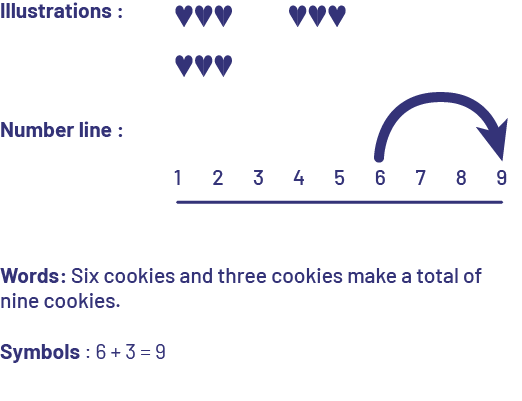 Different representations support students in making connections between drawings or illustrations, symbols and words. Below are different representations for the basic fact 6 + 3. Each of the four representations is appropriate. Students will find it less necessary to use visual representations as they develop some automaticity in solving basic number facts.