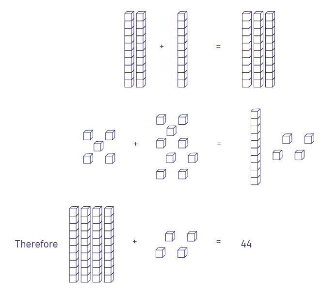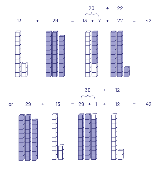 Once students know all the combinations of numbers to 10, they are prepared to work with numbers less than 20 that do not require regrouping (for example, 10 + 4, 11 + 6, 15 – 5, 16 – 3). After this, they can work with numbers less than 20 that do require regrouping (for example, 13 + 8, 17 – 9), and having developed this valuable regrouping concept, they can extend it to all other numbers less than 50 (for example, to calculate 33 + 8, the student decomposes 8 into 7 and 1, since they know that it takes 7 to get to the next ten. They add 33 + 7, which gives 40, then 40 + 1 which equals 41.