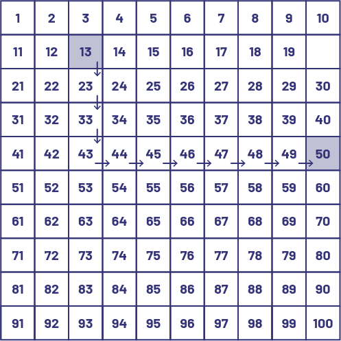 Students can then use a number chart to model the solution to the addition of 13 and 37 by doing the following: start at 13 on the grid, move down 3 spaces to 43, and then move 7 spaces to the right to 50.