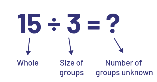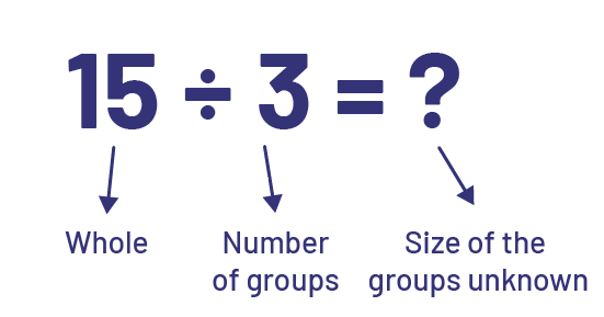 Division has a partitive interpretation when the total quantity and the number of groups are known (for example, 3 students want to share 15 apples equally) and we are trying to determine the number of apples each student will receive. For example: