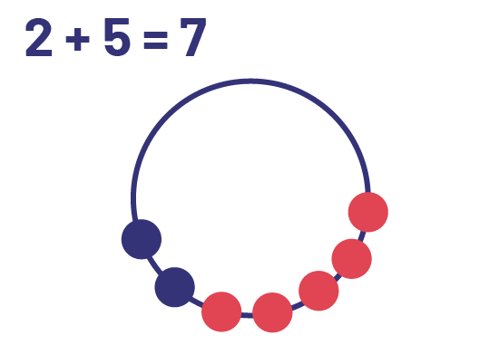 Ask students to make a necklace by stringing 5 red beads and 2 blue beads, then suggest they write the corresponding number sentence.