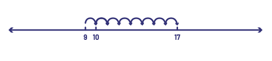 Allow students time to think and then collect their suggestions; for example, a student might say: I know that (9 + 1 = 10). I then added 7 by counting 11, 12, 13, 14, 15, 16, 17, so the answer is 17.