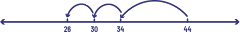 Allow students time to think and then collect their suggestions; for example, a student might express their idea as follows: Starting at 44, I went back 10 to get to 34. Then I went back 4 to 30, then 4 more to 26.