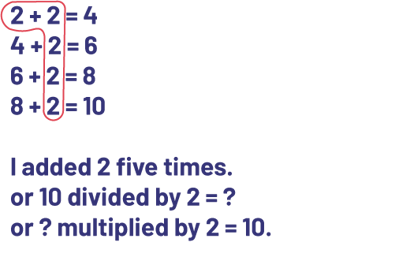 \(2 + 2 + 2 + 2 + 2 = ?\) or \(5 \times 2 = ?\)