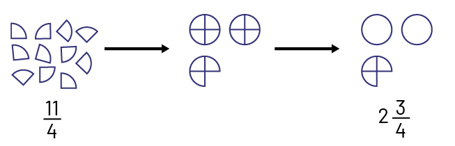 Learning about fractions usually begins with the use of proper fractions, that is, fractions less than 1. Beginning in Grade 2, students encounter fractions that represent quantities greater than 1 (for example, counting pieces of pie cut into fourths, there are 11 fourths left). Such situations lead students to mixed numbers (for example, \(2\frac{3}{4}\)).