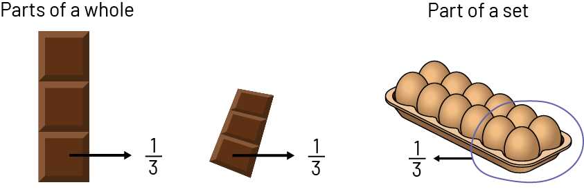 Understanding the representation of fraction quantities deepens the overall understanding of quantity. It is important to understand that fractions (for example, one half, one third, one fourth) can refer to a part of a whole (a length, an area, or a solid) or to a part of a set, where a collection of items represents the whole. For example, one third of a chocolate bar (part of a whole) represents a quantity of chocolate based on the size of the original bar. However, one third of a dozen eggs (part of a set) represents a quantity based on 12 eggs, which is four eggs.