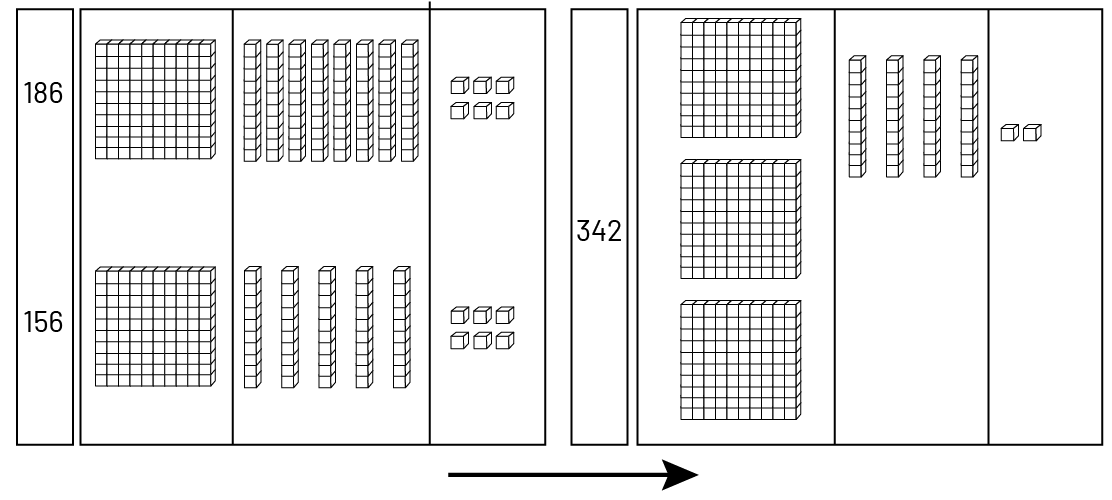 The same numeric expression (\(186 + 156\)) can be represented using drawings. In this way, students demonstrate a certain level of abstraction since a drawing is used to represent 100, 10 or 1.