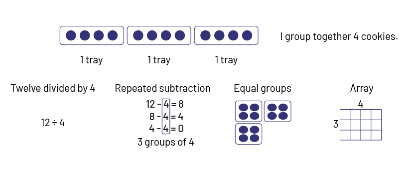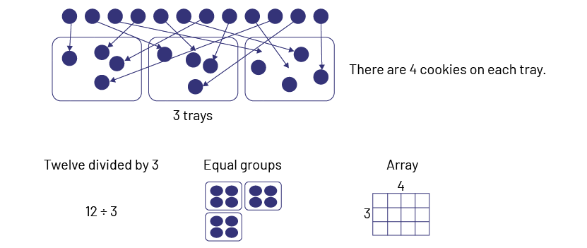- 12 cookies have been baked. If each tray contains 4 cookies, how many trays are needed?