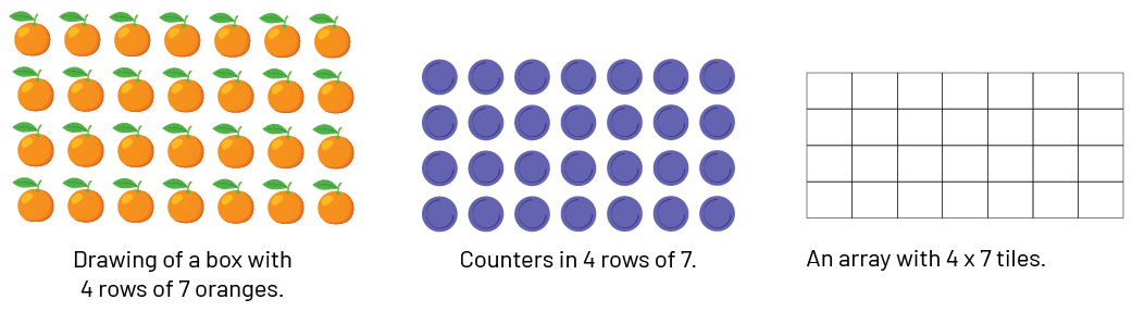 We can also highlight the inverse relationship of multiplication and division: \(28 \ \mathord{oranges} \div 4 \ \mathord{rows} = 7 \) or \(28 \ \mathord{oranges} \div 7 \ \mathord{rows} = 4 \).