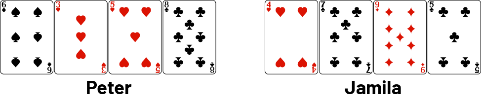 Students first count the number of flats used in the hundreds column. Peter has 8 hundreds and Jamila has 9. Therefore, Jamila's number is higher because she has one more hundred. Jamila gets one point.