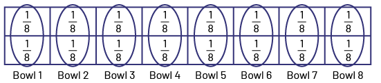 This made 8 equal parts, or eight eighths, which I cut into equal pieces. I put one piece into each bowl. I repeated this with another strip of paper, as there are 2 pieces of licorice to share. So after that, each bowl will have two one-eighth pieces of licorice.