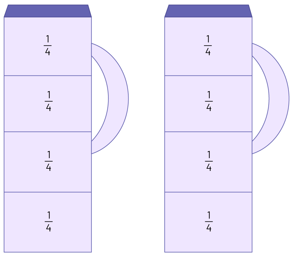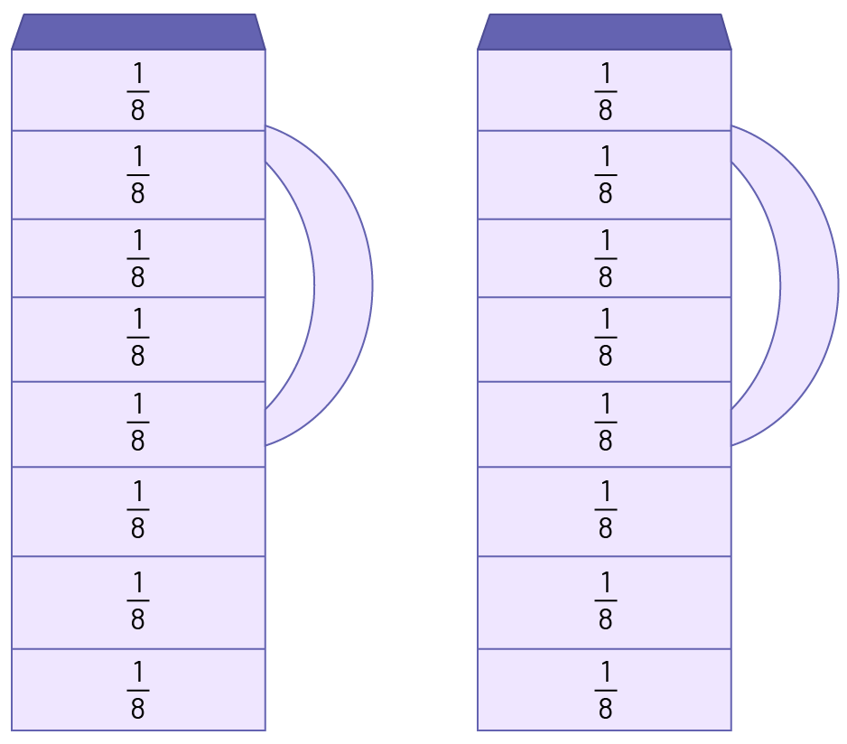 2 litres divided into 8 containers means 2 litres divided by 8 or \(\frac{2}{8}\).