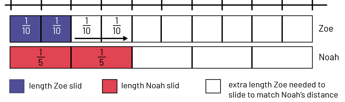 Zoe slid, and the teacher claims she slid \(\frac{2}{10}\) of the mat. Noah slid, and the teacher claims he slid \(\frac{2}{5}\) of the mat. What do you notice? What must happen for the two students to slide an equal distance?