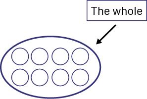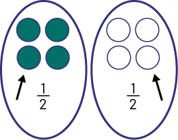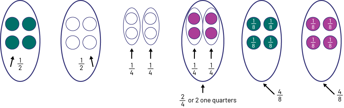 Note: Point out that the unit fraction (\(\frac{1}{x}\) of a set) always represents 1 group of a set divided into x equal groups, but that the fraction of a set represents a different quantity of elements depending on the number of elements in the set.