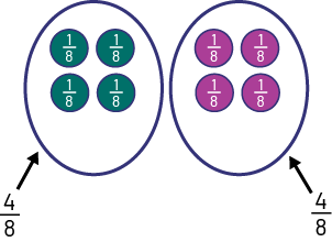 I compare the \(\frac{1}{2}\) of the whole, the \(\frac{2}{4}\) of the whole and the \(\frac{4}{8}\) of the whole and I notice that I have 4 balls in each case. So \(\frac{1}{2}\), \(\frac{2}{4}\) and \(\frac{4}{8}\) are equivalent fractions.