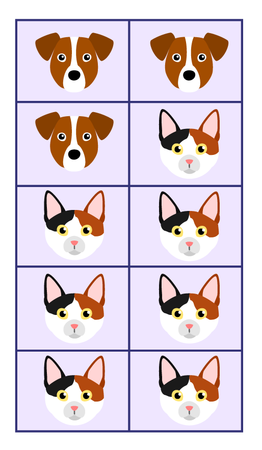 The frame is complete with 10 animals, which represents the whole. Each dog or cat represents one tenth (\(\frac{1}{10} \)) of the animals. There are 3 dogs. I count them in unit fractions: “1 one tenth”, “2 one tenths”, “3 one tenths”. So the dogs are three one tenths of the set of animals, which I can write as \(\frac{1}{10} + \frac{1}{10} + \frac{1}{10} = \frac{3}{10} \). According to this fraction, the 3 is the numerator and it represents the number of dogs. According to this fraction, the 10 is the denominator and it represents the total number of animals.
