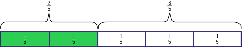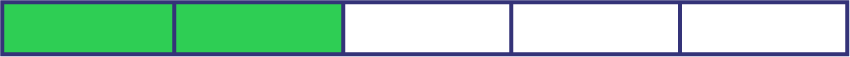 There are 5 boxes in all; 2 green coloured boxes and 3 boxes that are not coloured. Because there are five boxes in the strip, I know that each box is one fifth of the strip. There are 2 green boxes, so two fifths of the boxes are green, which I can write as \(\frac{1}{5} + \frac{1}{5} = \frac{2}{5} \). In the fraction \(\frac{2}{5} \), the 2 is the numerator and represents the number of green boxes. The 5 is the denominator and it represents the total number of boxes.