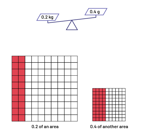 In these examples, even though the number 0.2 is less than the number 0.4 (\(0.2 < 0.4\)), 0.2 kg is a greater mass than 0.4 g because the units are larger, just as 0.2 of the large square is a larger area than 0.4 of the small square.