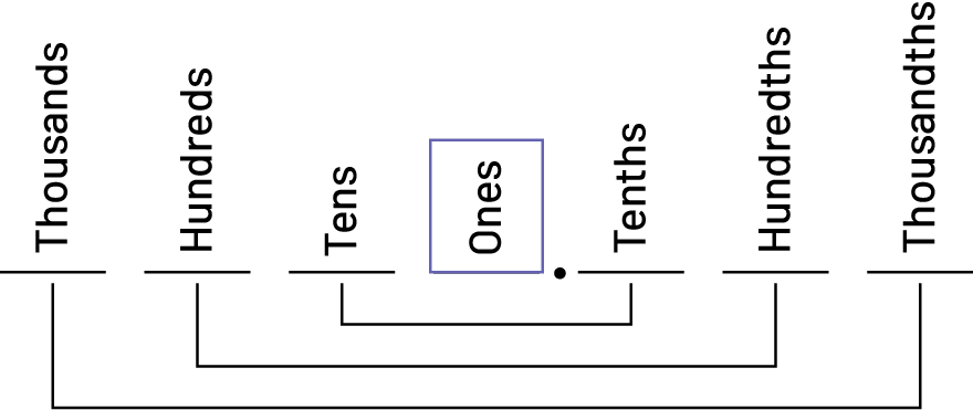 Note: Some students are under the impression that the decimal point is the centre of the decimal system. As a result, they tend to call the first position to the right of the decimal point the "oneths" place rather than the "tenths" place.