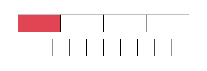 To establish the relationship between a fraction with a denominator that is not a multiple of ten (for example, \(\frac{1}{4}\)) and the corresponding decimal number, it is necessary to use the concept of equivalent fractions. For example, students can use strips of equal lengths as shown below to see that \(\frac{1}{4}\) is between \(\frac{2}{{10}}\) and \(\frac{3}{{10}}\).