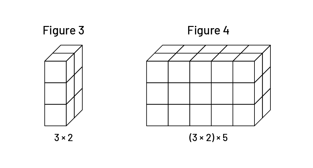 In Figure 1, we see that there are 2 rows of 5 cubes, that is, \(2\; \times \;5\) cubes. In Figure 2, we see 3 layers of \(2 \times 5\) cubes representing \(3\; \times \;(2\; \times \;5)\) cubes.