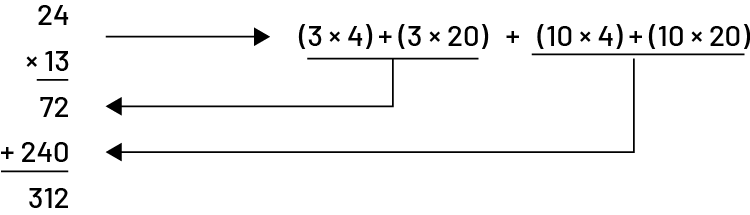 To calculate \(13\; \times \;24\), the 2 factors are decomposed: