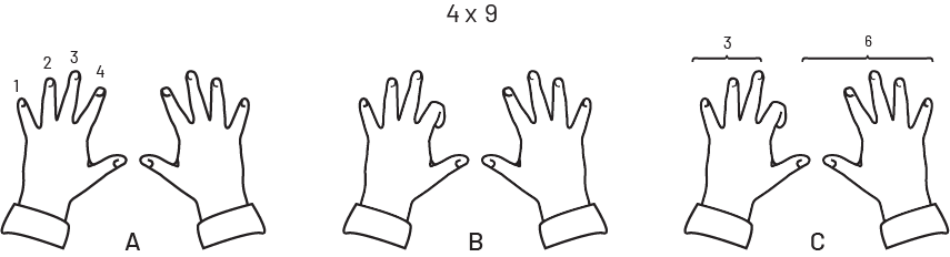Some students find this kinesthetic method useful for remembering the table of 9. Students are asked to hold out their hands with their palms facing away from them. Their fingers ( (beginning at the left little finger) are numbered from 1 to 10 (A). The finger that represents the multiplier of nine is folded down. If multiplying 9 x 4, the fourth finger is folded down (B). The number of fingers to the left of the folded finger represents the tens digit. The number of fingers to the right of the folded finger represents the ones (C). So, in this instance, there are 3 fingers to the left of the four, representing 30, and 6 fingers to the right of the 4, representing 6, for a total answer of 36.