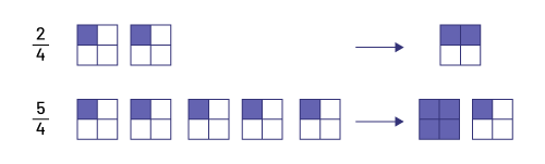 Highlight effective strategies for converting an improper fraction into a mixed number and vice versa by establishing connections between visual (semi-concrete) representations and the meaning of the numbers that compose them (the wholes, the fractional parts, the division, the remainder ). It is more important for students to understand the meaning of numbers and the operations performed than to memorize the steps to follow.